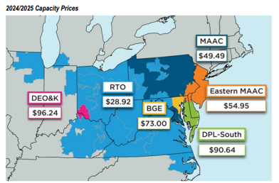 An increase in the number of constrained regions, and a decline in offered megawatts for the third consecutive auction, indicate the need for additional resources in certain areas. Prices were higher than the overall PJM price in five areas: MAAC (Met-Ed, Penelec, Pepco, PPL); EMAAC (Atlantic City Electric, Delmarva Power North, Jersey Central Power & Light, PECO, PSE&G, and Rockland Electric); DPL-S (Delmarva Power South); BGE (Baltimore Gas and Electric ); and DEOK (Duke Energy Ohio and Duke Energy Kentucky).