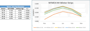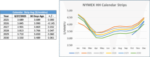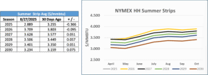 Natural gas futures have rolled into a new month, and the story is similar to 30 days ago. Prices are down in 2025 and 2026 strips, but the story changes in 2027 and beyond. EIA predicts a slight decrease in U.S. natural gas consumption in 2026, due in part to expected milder winter weather. However, for 2025, EIA is forecasting a 1% increase year-over-year and a record of 91.4 bcf/d.