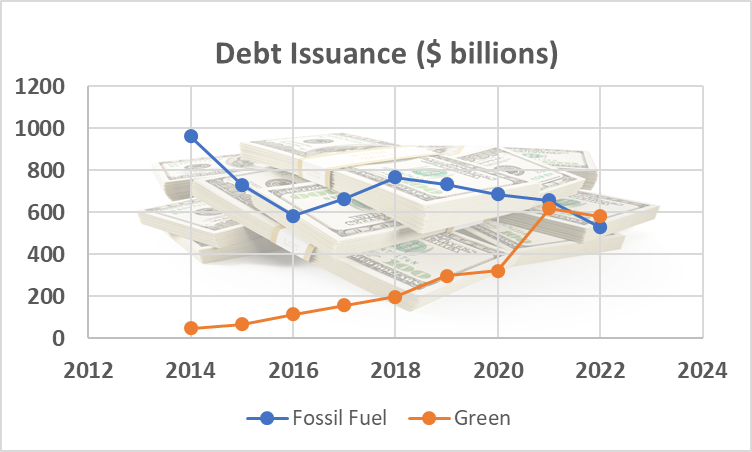 Global investment in renewables topped fossil-fuel projects in 2022, the first time for this debt market dynamic. Bloomberg reports that about $580 billion was arranged in 2022 for renewable energy and similar ventures, while oil, gas and coal notched about $530 billion. The story isn’t entirely about the virtues of green. High oil prices enabled many companies to depend less on capital markets for project funding. The trend, however, is undeniable as green project funding has been closing the gap steadily for nearly a decade.